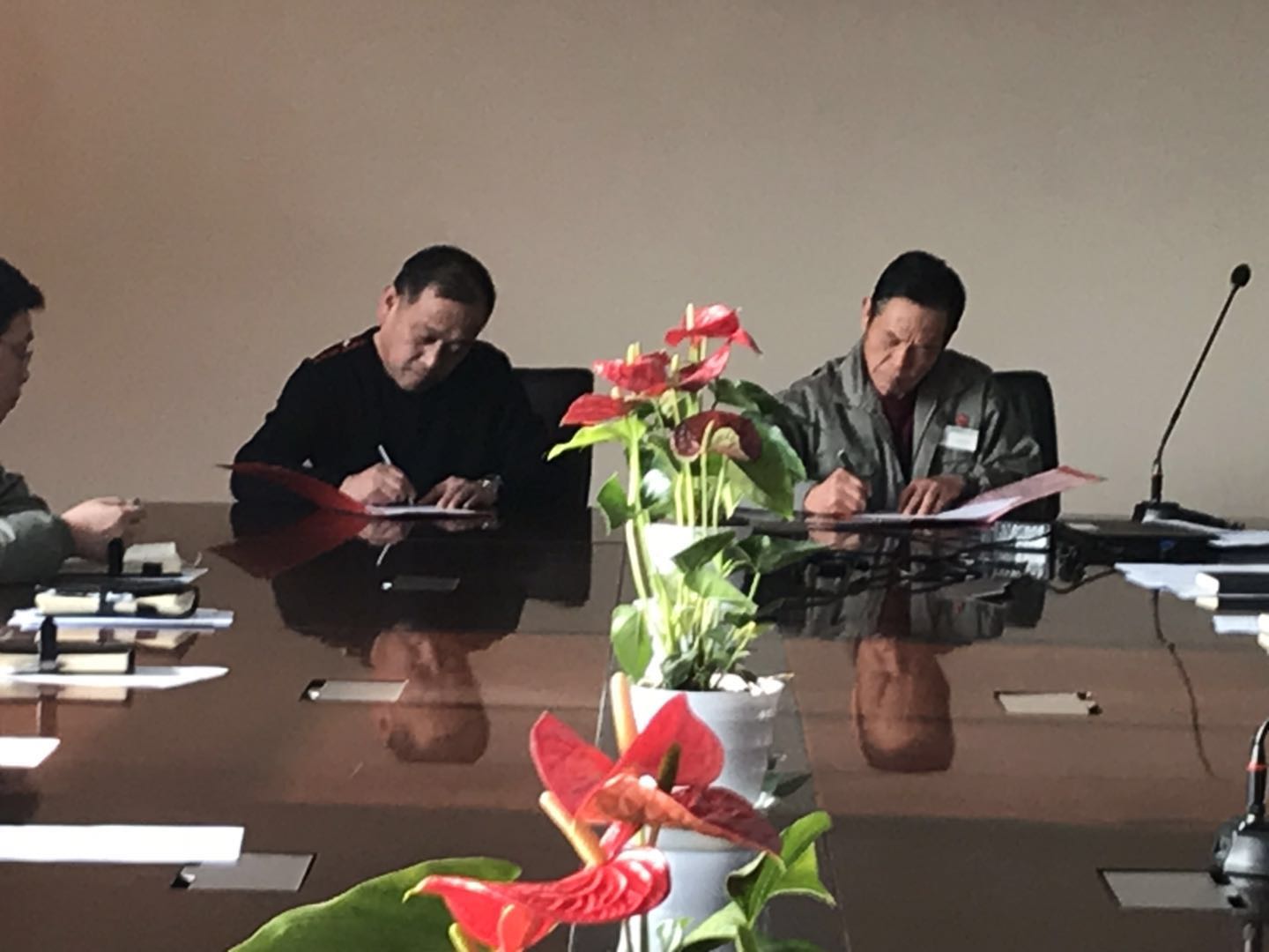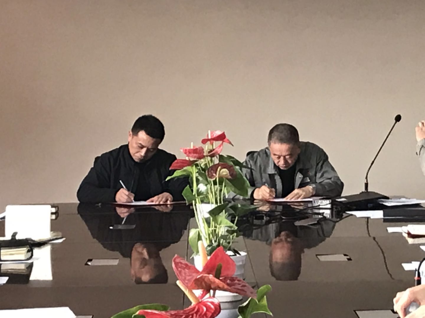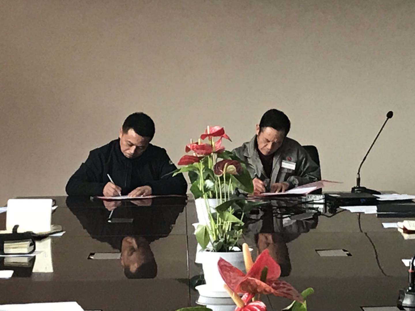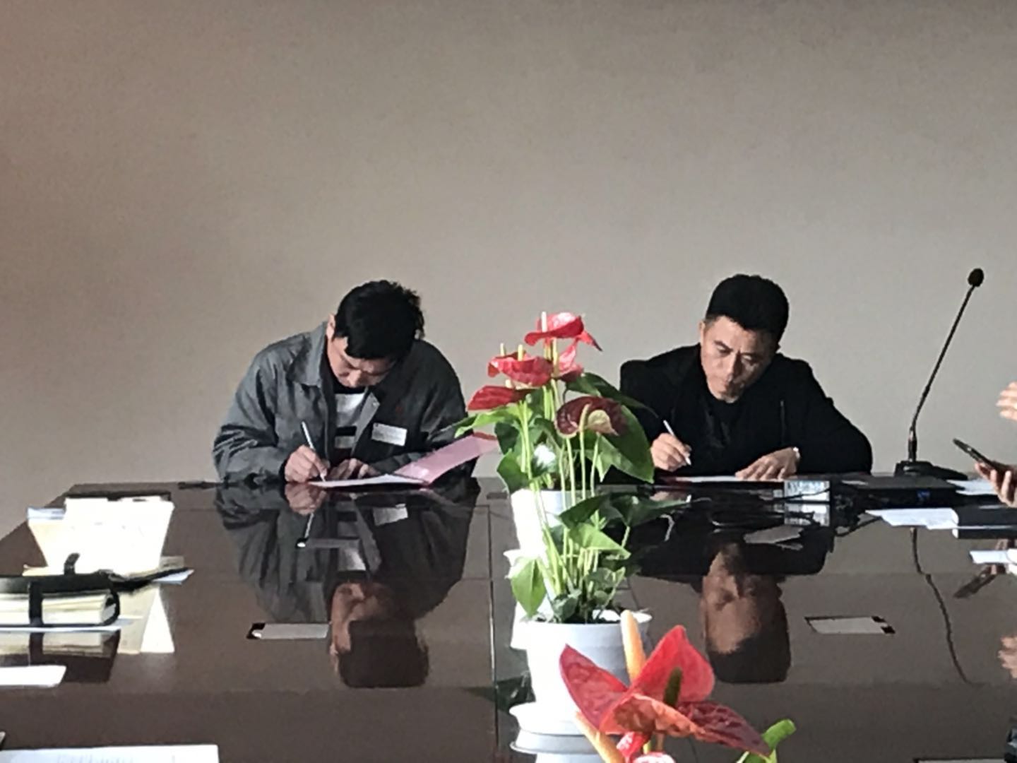 在總經理助理魯華宣布2019年公司年度目標之后,簽約儀式開始。陳總、周總、李總、候總分別與各責任人簽署《2019年目標責任書》及《2019年安全生產責任書》。